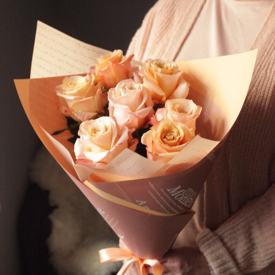На фото букет из 7 персиковых роз. В составе: роза 7 шт, дизайнерская упаковка 1 шт, атласная лента 1 шт, . Все цветы свежие и ароматные, букет красиво оформлен и отлично подходит для подарка. Доступна доставка цветов или самовывоз.
